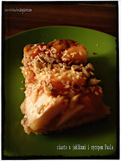 Następnie kisiel jabłkowy wyłożyć na podpieczony spód, posypać sezamem/słonecznikiem i piec w 180 stopniach jeszcze ok 20 minut (do suchego patyczka).